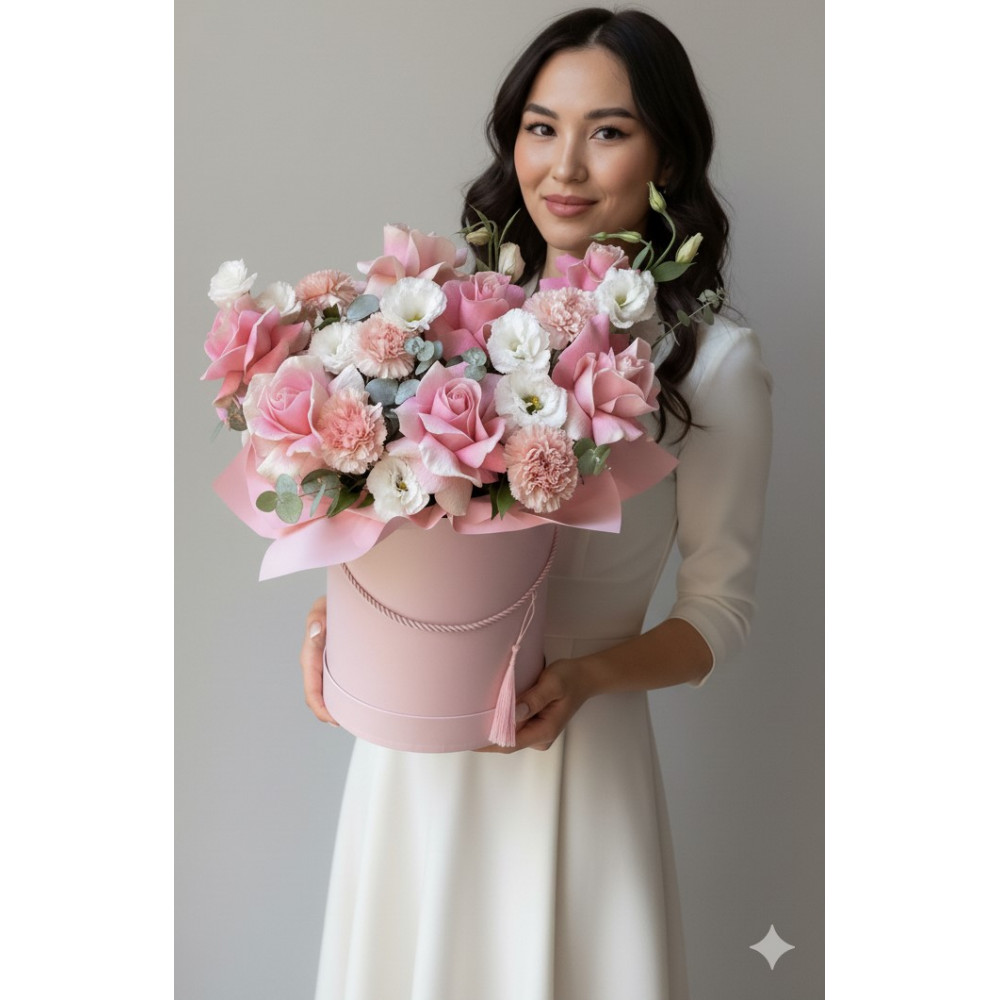 Коробка из букета цветов роз, лизиантусов, гвоздики и эвкалипта