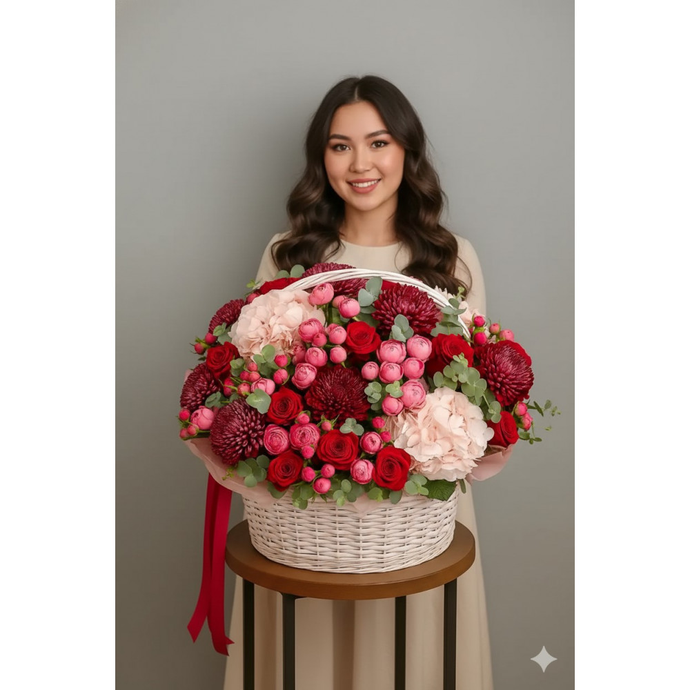 • Корзина букета из хризантем, гортензий, роз, спрей роз и эвкалипта